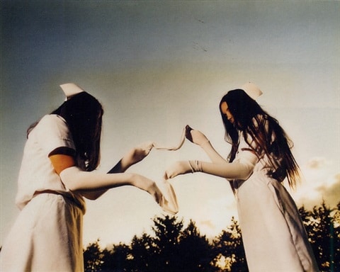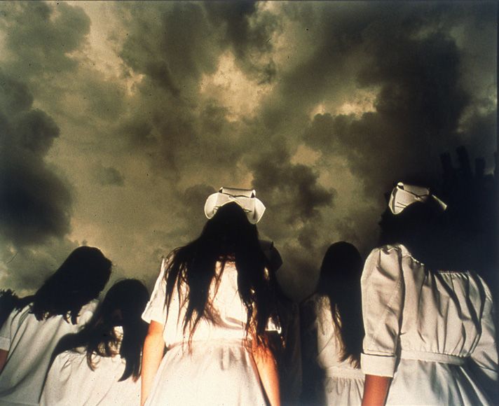 Les ciels sont tout aussi inquiétants dans l’œuvre d’Anna Gaskell. Et ces ciels se trouvent le plus souvent dans les photographies qui représentent des infirmières. Ces dernières portent le costume d’infirmière plus proche de la panoplie que du vêtement authentique du personnel de santé. En ce sens, elles apparaissent comme plus proches de l’interné en hôpital psychiatrique que de celles qui en prennent soin. Figées, prises de dos et comme hypnotisées par un ciel ombragé, comme comprenant que le ciel est angoissant. L’orage est proche, la menace omniprésente. Certaines des jeunes femmes sont également en blanc mais ne portent pas la coiffe de rigueur. On peut alors se demander s’il s’agit d’infirmière ou de patientes. Mais toutes sont figées, comme paralysées par ce ciel qui semble annoncer la colère des dieux.