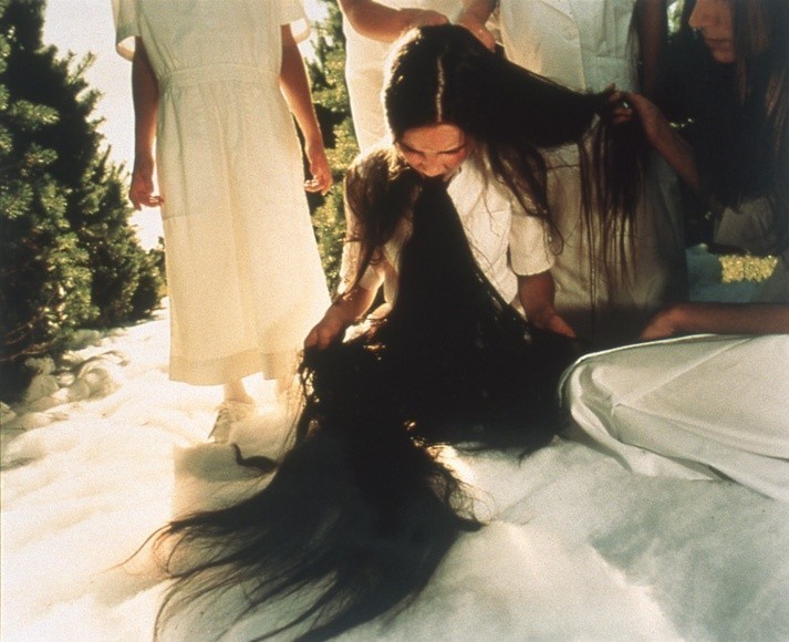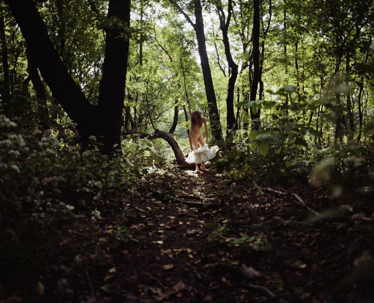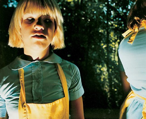 L’une de ces photographies, en particulier, montre des jambes gainées de collants blancs suspendues dans les airs avec à leurs pieds, sur le sol, des cordes à nœuds marins. Simulation d’une pendaison collective mais dont les nœuds auraient été retirés alors que les corps continuent de flotter dans les airs. Elles sont suicidèrent les adolescentes chez Anna Gaskell. Les contes de fées virent à la tragédie et les petites filles en tablier de jardinières n’ont rien de gentilles cultivatrices ou d’innocentes planteuses de roses. Dans la photographie ici citée, deux jeunes filles sont présentes : l’une de face, l’autre de dos. Les deux jeunes préadolescentes sont vêtues de manière identique : petite robe bleu ciel, tablier jaune. Elles sont dans une forêt mais le regard de la jeune fille présente de face sur sa congénère est intriguant : corps et tête sont immobiles, seul le regard est incurvé, oblique. Il y a plus que de la peur dans ce regard, on y perçoit la sensation d’une menace, d’une surveillance qui serait opérée par la seconde sur la première bien que cette seconde soit de dos. Tout se passe comme si la jeune fille au premier plan se sentait épiée et comme présentant une punition corporelle possible pouvant intervenir à chaque instant. L’angoisse est si présente que l’on finit par se demander si les petites cultivatrices plantent des fleurs ou s’apprêtent à enterrer un corps en forêt. Le souffle et la respiration semblent retenus, l’angoisse est palpable. Les forêts, chez Anna Gaskell n’ont rien d’enchantées, les trolls n’y sont pas de merveilleux petits lutins joueurs, non les forêts sont menaçantes, denses, opaques, brumeuses.
