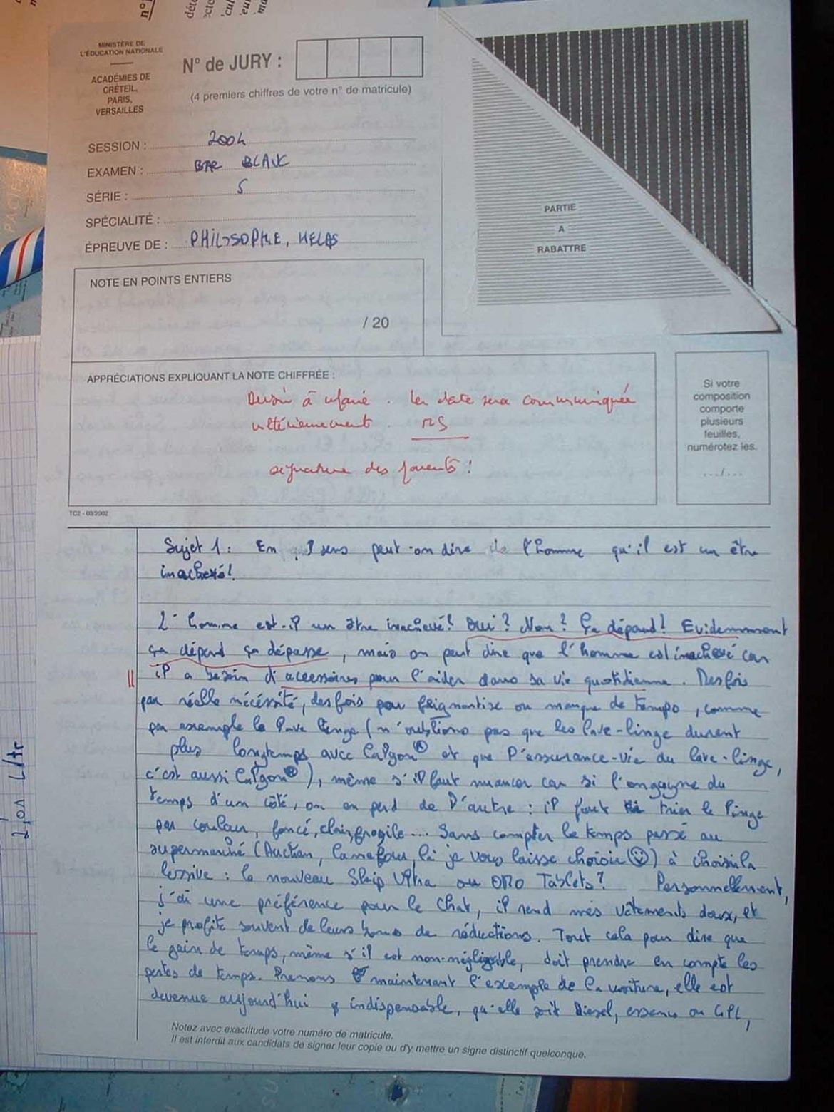 Personnellement, je suis d’accord avec palpatine. C’est vrai , pas une faute d’orthographe, c’est fluide , extrêmement spirituel et loin d’être idiot ou hors sujet. Il nous remet tout cela bien , j’entends de façon académique pour le jour du BAC et il peut très bien décrocher une bonne note. Moi je lui collais 20 et lui aurais demandé de me refaire le devoir car au bout du compte dans sa conclusion , l’élève reconnaît qu’il ne sait pas ( éviter la copie blanche) et qu’il est donc inachevé…Si son prof avait retenu Socrate, il se serait souvenu de la maïeutique … c’est le prof qui est inachevé! Quant à la remarque sur le fait qu’il s’agit d’une section scientifique, c’est hors sujet aussi; j’ai un BAC C et j’ai eu la meilleure note de mon département pour ma section et le sujet choisi ( Hegel). Je suis d’accord avec philocours : J’ADORE !! :))