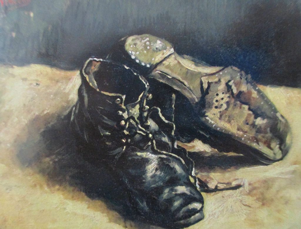 Cette vérité on peut l’observer lorsque Heidegger parle de la toile « les souliers » de Van Gogh, signalant que cette œuvre rend compte de la solidité de la chaussure, elle manifeste les longues heures de labeur, la marche dans les sillons boueux, le travail de celui qui les porte et en tant que telle, l’œuvre témoigne de l’être du soulier, la vérité du soulier et du monde qu’il évoque. Contrairement au produit qui voit sa solidité (le matériau qui le constitue) disparaitre au fur et à mesure qu’il se réalise comme outil, l’œuvre d’art exalte définitivement le matériau en lequel elle émerge à la présence parce que fusionnant avec celui-ci. Œuvre et matériau ne font alors qu’un, ils sont solidité. L’œuvre manifeste ainsi l’impénétrabilité de la Terre. Contrairement au monde qui est ouverture, la Terre s’identifie au fermé, le retrait à partir duquel tout peut se dévoiler. Elle est la sauvegarde de la possibilité de l’ouverture au monde. Et faire venir la Terre ne signifie pas la convoquer mais la laisser advenir en tant que définitivement fermée. Et faisant venir la Terre, l’artiste amène l’oubli au paraitre sans pour autant dénaturer l’essence de cet oubli. L’œuvre d’art révèle ainsi ce qui fonde le monde. Mais Terre et monde entretiennent une relation conflictuelle, sans laquelle, pourtant, aucun des deux ne pourrait se soutenir :