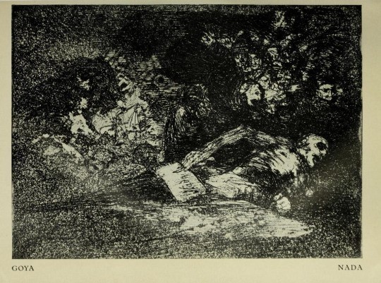 Entre 1810 et 1815, Goya réalise une eau-forte et aquatine intitulée « Nada » (Rien). On premier plan de cette œuvre, on peut voir un cadavre qui se déterre lui-même et tenant une feuille de papier sur laquelle est inscrit le mot « Nada » comme pour répondre à la question religieuse : « après la mort, il n’y a rien », aucun arrière-monde, aucun au-delà. Au second plan, on peut voir une foule de têtes à l’aspect rempli d’avidité et de curiosité. Cette foule semble criarde comme si elle demandait au déterré : « alors, après la mort ? Tant pis pour le religieux, après l’existence, il n’y a rien à attendre : nada !