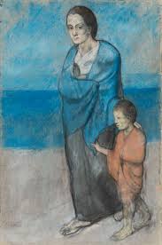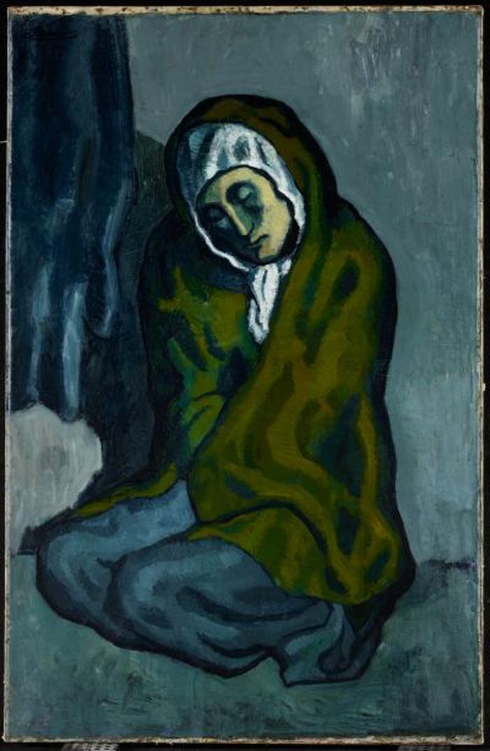 Cette toile fait écho à la « miséreuse accroupie » de 1902. Là aussi, la misère s’auréole de quelque chose d’iconique. Elle est proche de la Madone. Elle aussi recroquevillée, accroupie sur le sol manifeste cette extrême solitude que l’on trouve dans les toiles bleues de Picasso. Il y a du sacré dans ces deux toiles, de la noblesse dans la misère et l’empathie de Picasso pour ses modèles et les scènes qu’il peint est indéniable. On sent ici une immense tendresse pour tous les démunis.